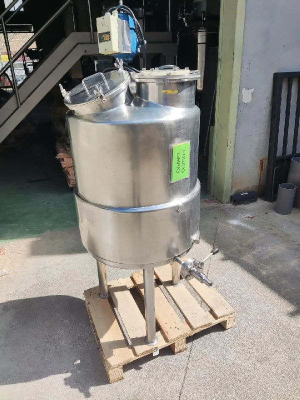 Cuve verticale fabriquée par TEMEC en acier inoxydable 316 d'une capacité de 600 litres. - Fond supérieur : Klopper avec agitation à ancre avec grattoirs, trou d'homme, 6 raccords à pince, 1 manomètre et 1 voyant avec foyer d'éclairage. - Corps : avec chemise. - Fond inférieur : Klopper a