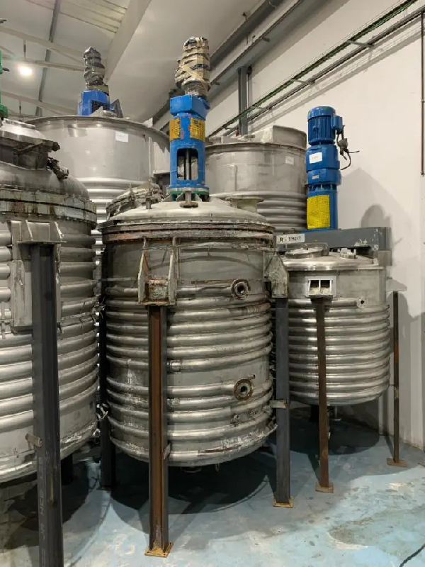 Réacteur vertical en acier inoxydable 316 d'une capacité totale de 5 000 litres (4 000 utiles). L'équipement dispose d'un agitateur, d'une demi-barre et de trois disjoncteurs de courant à l'intérieur.