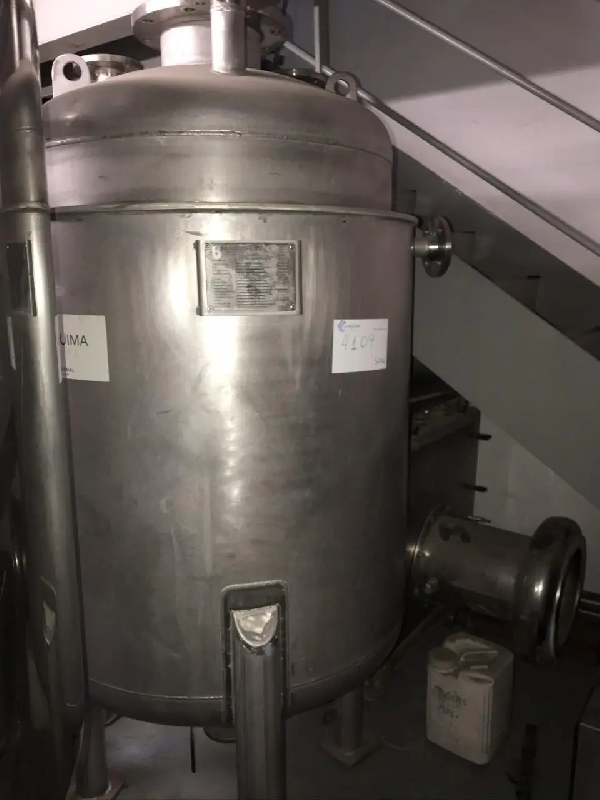 Réacteur vertical avec enveloppe en acier inoxydable et d'une capacité approximative de 500 litres. Fond supérieur de type Klopper à 4 brides et 2 oreilles de levage