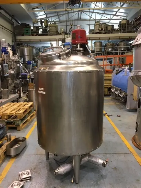 Réacteur vertical en acier inoxydable d'une capacité de 500 litres. Fond supérieur Klopper à agitation décentrée, type hélice bipale, trou d'homme et raccords.