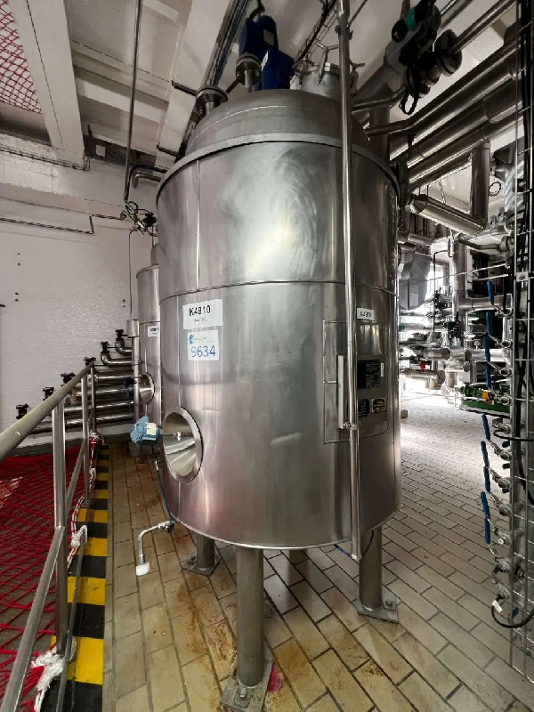 Réacteur vertical en acier inoxydable 316 d'un volume de 4 000 litres. Fond supérieur sphérique vissé au corps avec trou d'homme avec couvercle ouvrant et fermetures manuelles, agitation double flux type hélice bipale avec racleurs à 4 hauteurs, 2 raccords type NW et un foyer. - Corps avec c