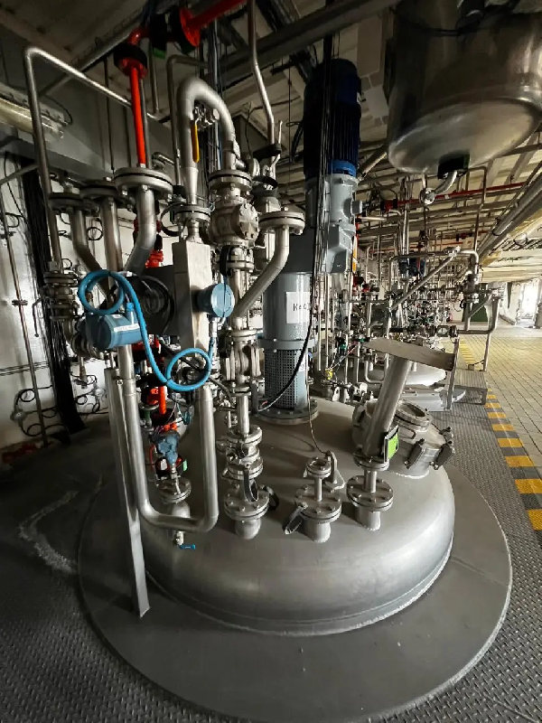 Réacteur vertical en acier inoxydable 316 d'une capacité totale de 5 000 litres (4 000 utiles). L'équipement dispose d'un agitateur, d'une demi - barre et de trois disjoncteurs de courant à l'intérieur.Klopper fond supérieur vissé au corps avec trou d'homme, 5 raccords type bride et agitation