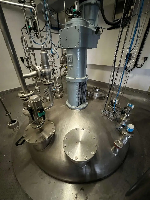 Réacteur en acier inoxydable 316 d'une capacité de 3200 litres. Fond supérieur Klopper avec trou d'homme à ouverture manuelle et agitation centrale. Fond inférieur Klopper avec décharge par le bas. Sur des affiches. - Référence : C7694