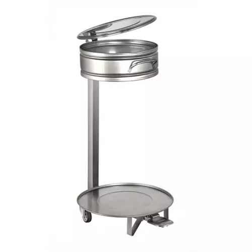 Porte - sac poubelle mobile en inox a pédale de 50 L. Structure tubulaire en inox 201. Idéale pour une utilisation dans le espaces de santé. Large pédale en inox avec au milieu un patin en caoutchouc anti - dérapant. Hygiénique, l'utilisateur utilise son pied pour ouvrir le sac poubelle au