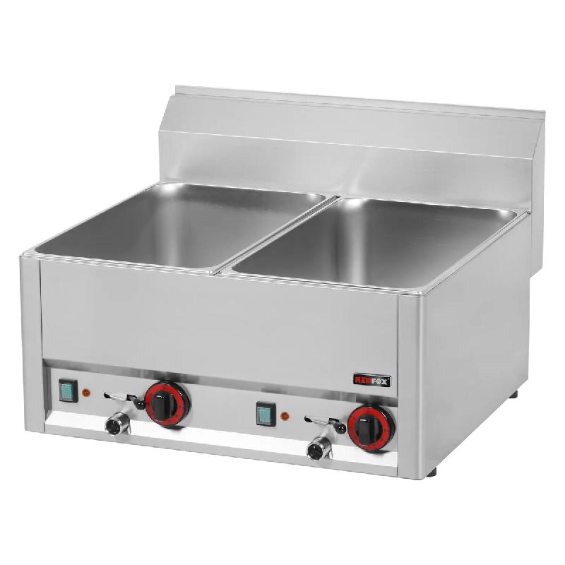 Bain - marie électrique GN 1/1 (150 mm), construction inox, température réglable 30 - 90 °C, chauffage sous la cuve, vidange frontale pour un entretien facile, modèle double cuve. - Marque : RedFox - Délai de livraison : 1 - 3 jours ouvrés