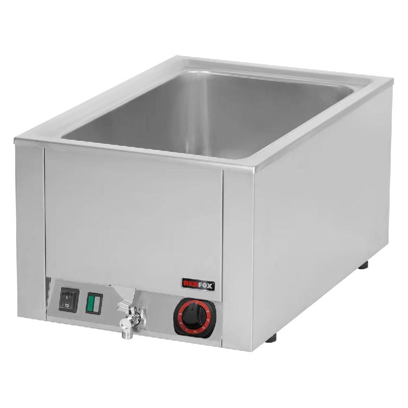 Bain - marie électrique GN 1/1 (150 mm), construction inox, température réglable 30 - 90 °C, chauffage sous la cuve, vidange frontale pour un entretien facile, modèle à une cuve. - Marque : RedFox - Délai de livraison : 1 - 3 jours ouvrés