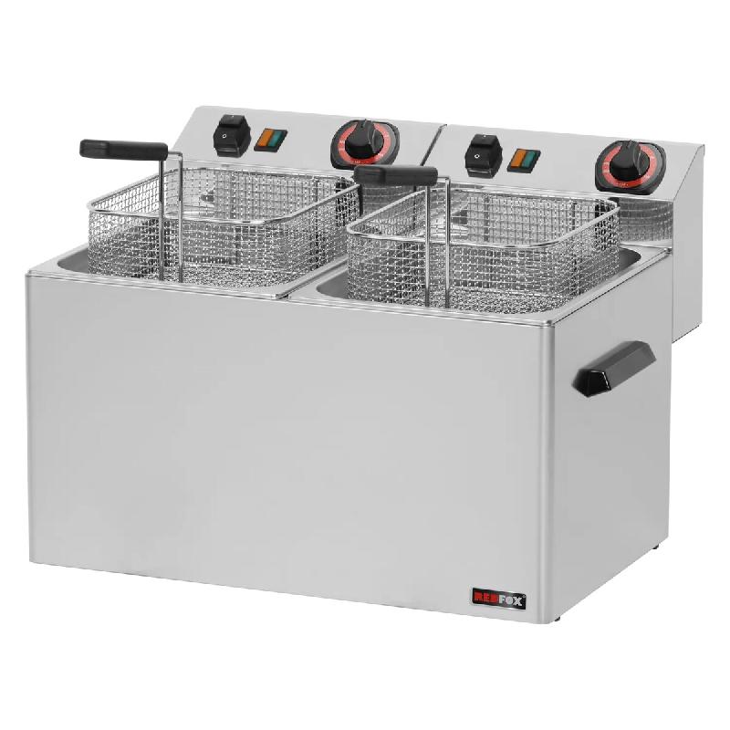 Friteuse électrique double en inox AISI 304 avec deux cuves de 8 L, alimentation 2x 230 V. Spécial poissons, équipée d'éléments chauffants grande surface, thermostat de sécurité et voyants de fonctionnement. Compacte et robuste pour usage intensif. - Marque : RedFox - Délai de livraison :