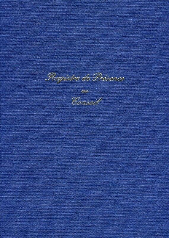 Couverture rigide en pleine toile bleue. Titre frappé or sur la première de couverture et la tranche. Impression encre grise et bordeaux sur papier offset 100 g/m². Tranchefile rouge pour plus de solidité. Garde-titre personnalisable, la feuille de présence de chaque conseil est numérotée.
