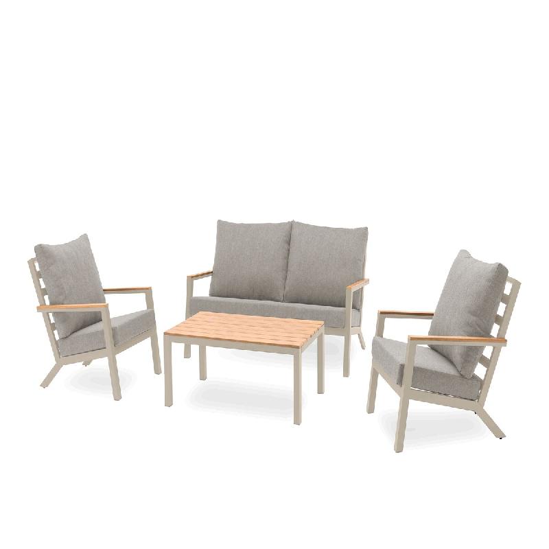 Salon de jardin 4 places en aluminium effet bois, composé d'une banquette 2 places, de 2 fauteuils et d'une table basse. Coussins déhoussables en toile 100% polyester gris. - DIMENSIONS - Banquette : L 146 x l 69 x H 70 cm - Fauteuil : L 72 x l 69 x H 70 cm - Table : L 90 x l 57 x H 35 cm - C