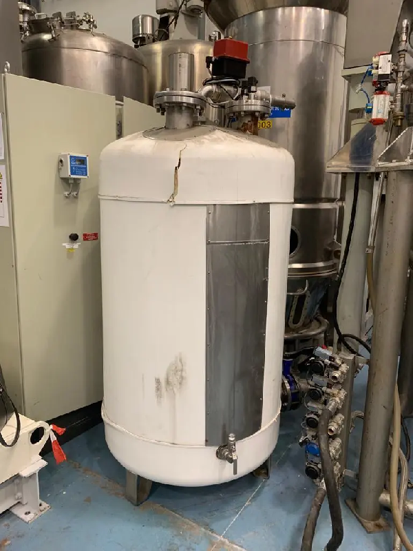 Cuve interaccumulatrice verticale fabriquée par MECALIA en inox 316 d'une capacité de 800 litres. Résistant à la chaleur. Fond supérieur Klopper avec 4 buses.