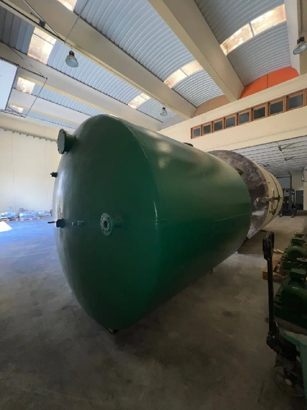 Cuve en fer d'une capacité de 12 500 litres. Klopper haut en bas. Judas latéral. Fond inférieur Klopper avec décharge par le bas. Sur 4 pattes.