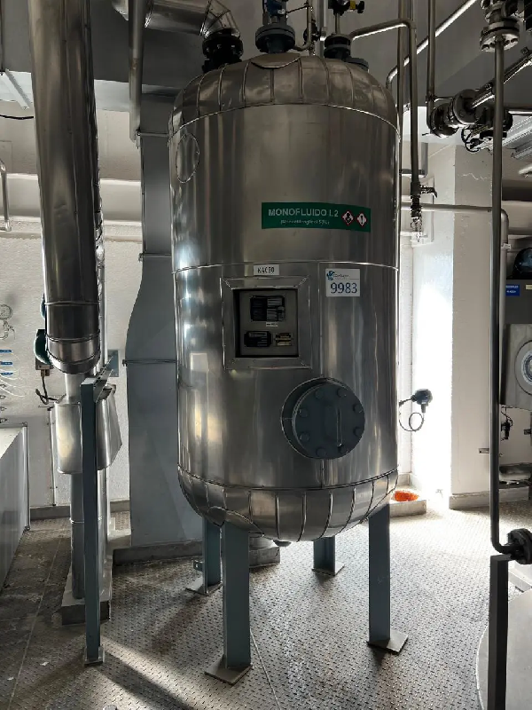 Cuve en acier inoxydable d'une capacité totale de 19 000 litres. Agitation à hélice à différentes hauteurs. Fond inférieur Klopper avec décharge par le bas. Longueur de la virole : 3000 mm Roue d'agitation : 1400 mm - Référence : E7918