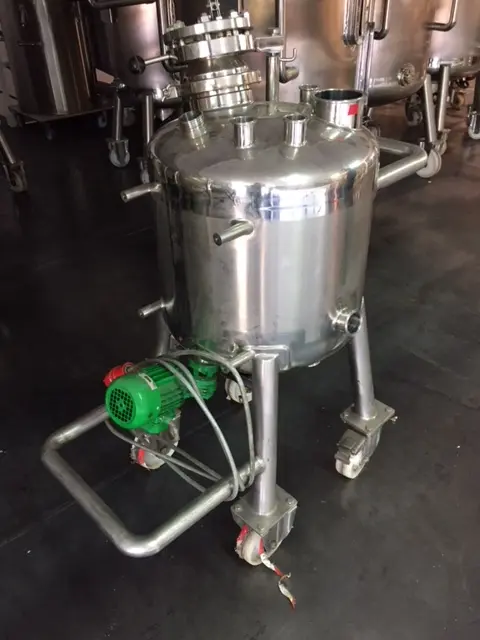 Cuve en acier inoxydable 316L d'une capacité de 90 litres. Fabriqué par Sapphire Engieering en 1998. Finition intérieure polie miroir. Fond supérieur Klopper avec voyant, 4 buses à pince et une buse filetée. Décharge de type pince sur le fond inférieur avec clapet à siège. Une sortie latérale de type pince et deux sorties filetées. Sur 4 roues pour un déplacement facile. Agitation magnétique à hélice avec moteur électrique de 0,25 kW à 2720 tr/min. Caractéristiques techniques du corps : Pression de conception : 3 bar / vide Pression d'essai : 4,73 bar Température de conception : -10 / 135 ºC