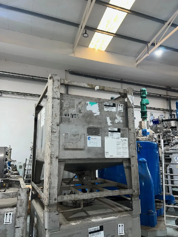 Cuve carrée fabriquée par GWS FINCONT en acier inoxydable 316L, d'une capacité de 800 litres. Fond conique avec décharge par le bas. Pression de service maximale 0,2 bar.