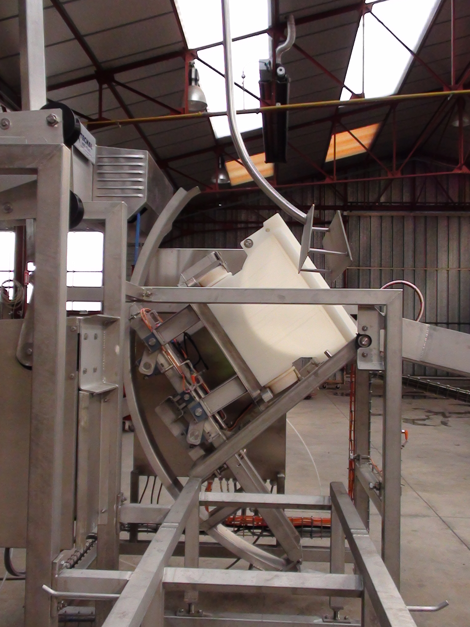 - Les bras de la colonne s’enclenchent dans les crochets latéraux du bac et le soulèvent. À la hauteur souhaitée, le bac est basculé afin d’en vider le contenu. - Pas de manutention humaine, pas de risque de chute, respect des normes de sécurité, ergonomie du poste de travail. - Vitesse