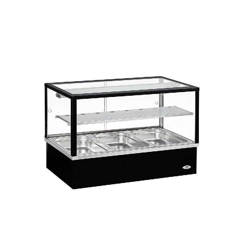 Vitrine chaude fermée avec : - Vitre bombée basculante - Éclairage halogène intégré - Plan de présentation incliné à 5° - Profondeur utile : 700 mm - Caractéristiques : - Régulation électronique de la température - Remplissage en eau automatique - Hygrométrie contrôlée - So