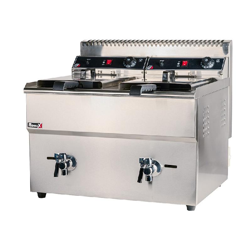 Friteuse À Gaz Naturel Professionnelle en Acier Inoxydable de 18+18 Litres de Table ROMUX pour hôtellerie, bars, restaurants et services de restauration.