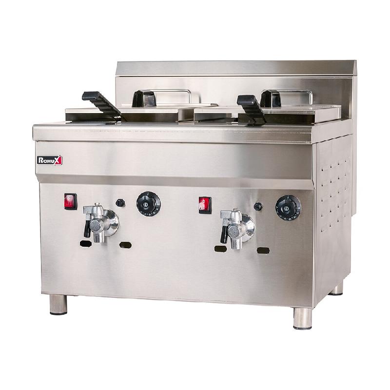 Friteuse À Gaz Naturel Professionnelle en Acier Inoxydable de 18+18 Litres de Table ROMUX pour hôtellerie, bars, restaurants et services de restauration.