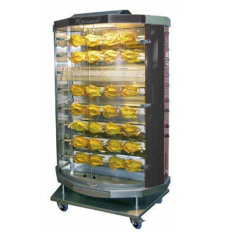 RPB - 5C - Matériel de cuisson pro economie d'échelle le produit de refence Rôtissoire a balancelles, 25 poulets Caractéristique techniques : - Version avec 5 balancelles rotatives, chacune pour 5 volailles, gigots, rôtis, gibier... - 4 faces vitrées, 2 portes en verre 'securit' sur la