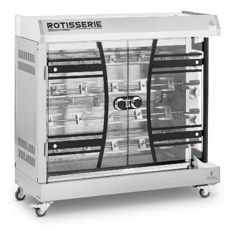 ↘️ Description du produit:Rôtissoire poulet professionnelle au gaz pour jusqu'à 32 kg de délicieuse viande grilléeAvec cette rôtissoire professionnelle de Royal Catering, tout le monde sera rassasié! Proposez à votre clientèle de savoureux poulets, porchetta, rosbifs et rôtis à la broche et bien d'autres délices encore, fraîchement préparés et croustillants. Sur quatre broches rotatives pouvant accueillir chacune 4 poulets, vous préparez les spécialités de votre choix, uniformément tendres et avec une peau croustillante. Pour cela, vous pouvez allumer ou éteindre les zones de cuisson indépendamment l'une de l'autre, de sorte que vous pouvez même préparer différents plats en parallèle et ravir vos clients avec une offre variée.