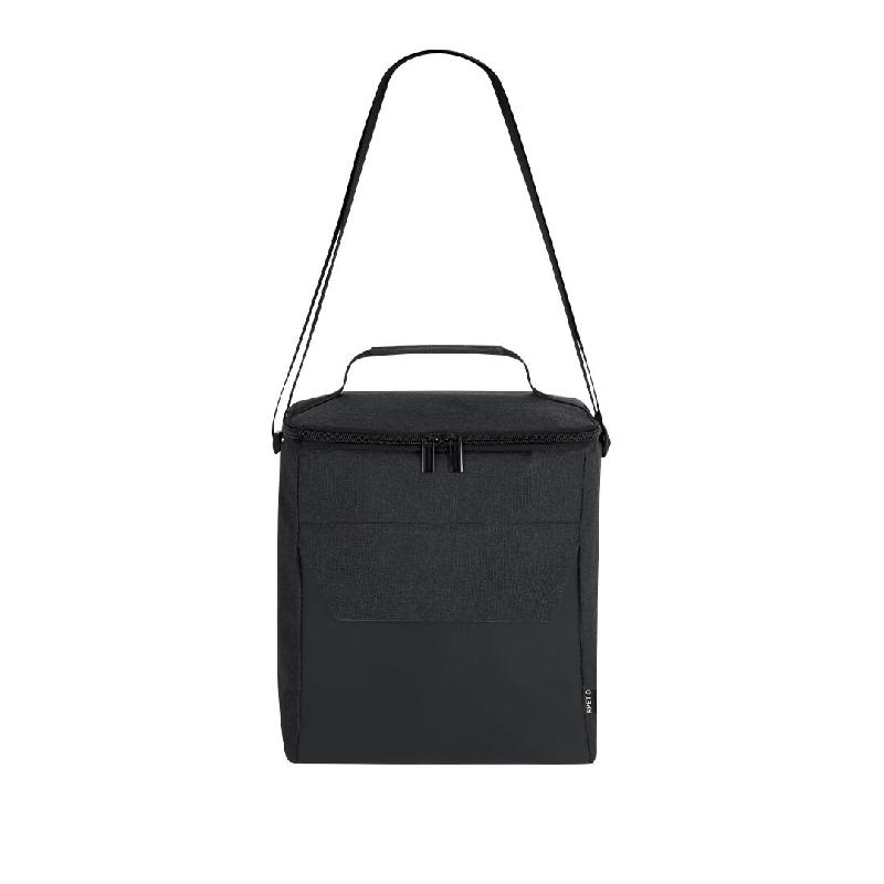Sac isotherme RPET avec : - Rembourrage PEVA - Compartiments zippés - Poignées avec velcro - Bandoulière réglable - Caractéristiques : - Matériau : Polyester RPET 600D, labélisé RPET - Couleur : Noir - Poids : 384 gr -