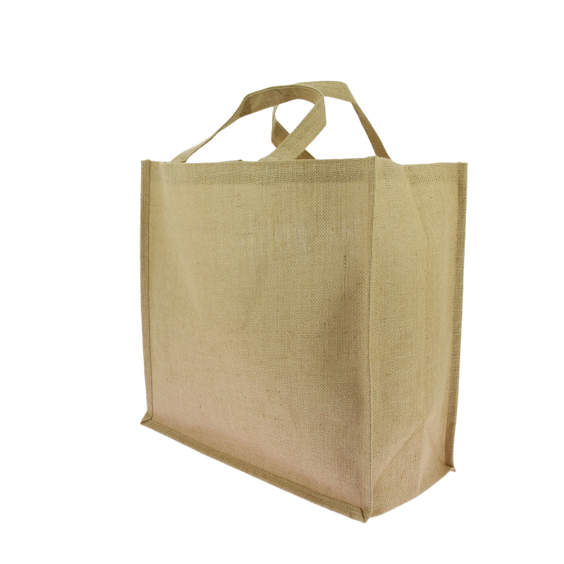 Caractéristiques du sac de course personnalisé - Jute naturel sans laminage 260gsm - Ansces rondes en coton biologique naturel - Dimensions : 46H x 35L x 20P cm -