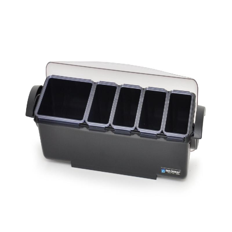 Boîte 5 compartiments dôme - 585 x 155 x 155 mm - SAN JAMARProduit destiné aux professionnels, conçu pour une utilisation régulière en environnement CHR.Convient en tout lieu et permet le stockage des garnitures, condiments, des pailles, des agitateurs ou pics de différentes tailles. Packs réfrigérés également disponibles pour maintenir les condiments à la température désirée (vendus séparément).Compatibilité et usage associéConvient en tout lieu et permet le stockage des garnitures, condiments, des pailles, des agitateurs ou pics de différentes tailles. Packs réfrigérés également disponibles pour maintenir les condiments à la température désirée (vendus séparément).Points fortsLe couvercle bombé rétractable pivote pour un accès facile.Le couvercle bombé augmente la capacité, vous permettant de remplir largement les bacs.Permet de conserver les produits frais et d'avoir moins de déchets.Le Dôme ® permet de garder les comptoirs spacieux et propres.Norme NSF et passe au lave-vaisselle.Contient : 1 bac profond 2.2L, 4 bacs standard 0.55L, 2 boîtes amovibles, 2 embouts.Entretien adapté à l'exploitationIntégration simple au posteUtilisation régulière en environnement professionnelOrganisation au quotidienEn production, Valider la compatibilité, prévoir le rangement et maintenir un plan de nettoyage régulier aide à conserver une exploitation fluide.Caractéristiques techniquesDimensions (L x P x H) : 585 x 155 x 155 mmMatériau : Plastique haute résistanceCapacité : 4400Poids : 1,81 kg