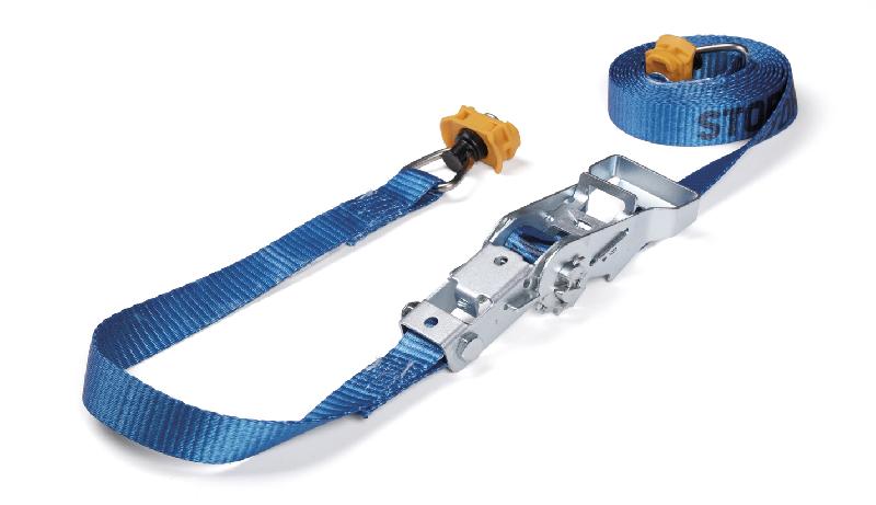 Une courroie d’arrimage avec mécanisme de rétraction peut s’avérer d’une grande aide, surtout si l’usage est simple. Dans ce modèle : - La sangle ne doit pas être enfilée. - Une fois que le levier est retenu derrière le cliquet d’arrêt, la sangle se détache et se déroule. - Si