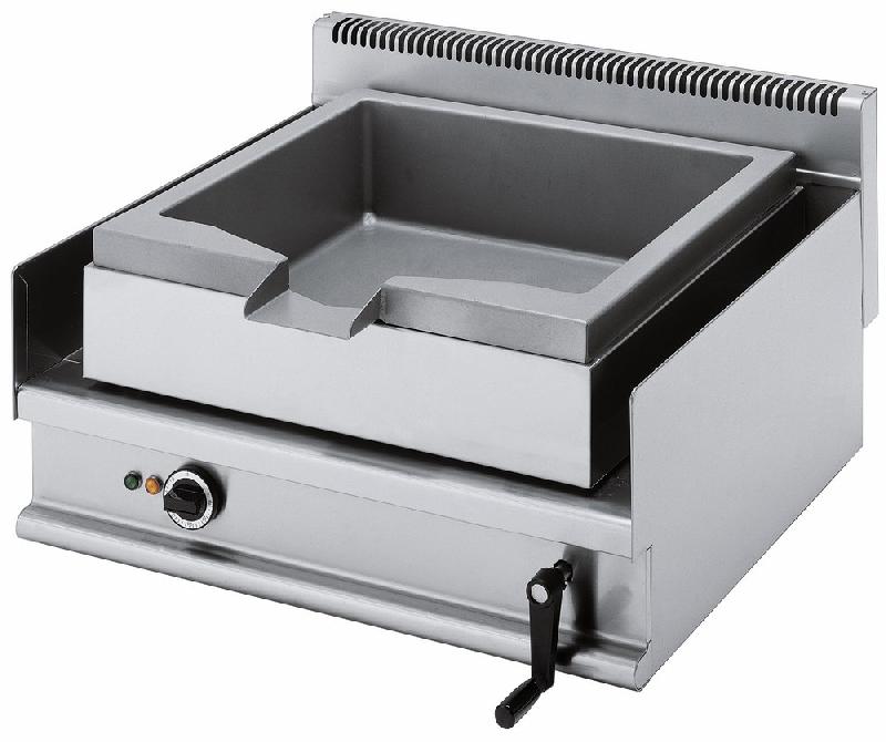 7178.0545 - Sauteuse basculante professionnelle electriqueDimensions (LxPxH) (mm) : 800x700x900Tension (Volt) : 400Puissance totale (kW) : 9Plage de temperature (°C) : 50 - 300Capacite (Ltr) : 60Type levage : Levage manuel