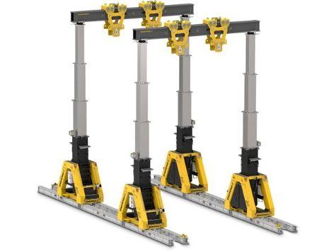 Leurs mâts télescopiques lèvent/déplacent des charges de 20 à 800 tonnes par roulage motorisé guidé sur pistes au sol. - Ils sont composés de 4 pieds indépendants gérés par 1 module de puissance avec pupitre de commande ou radiocommande. - capacité minimum : 20 tonnes.