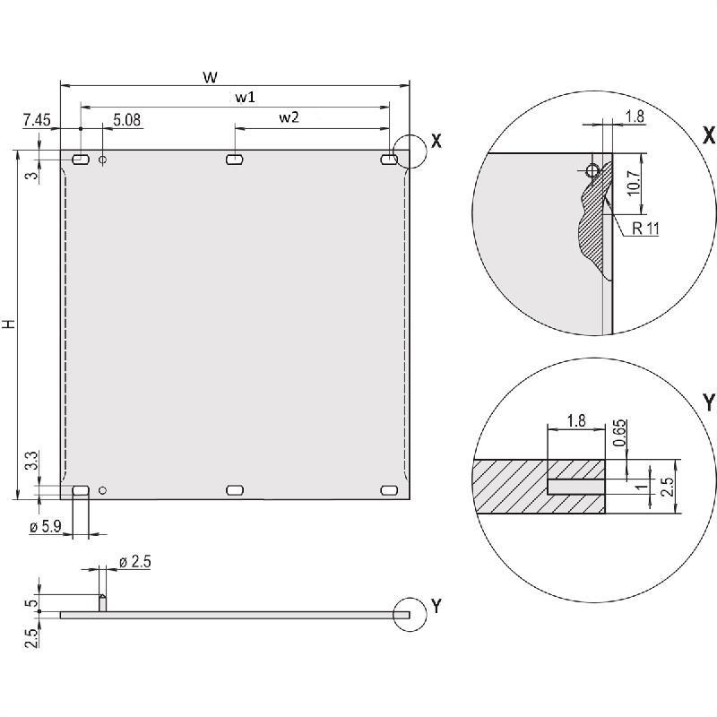 Face avant, blindage Refrofit, 6 U, 6 FFRONTPL.EMC 6U 6HP W.PINFace avant, alu 2,5 mm, face vue anodisée, face d'appui passivée couleur, 2 pions de centrage enfoncés, acier inoxydable - Blindage par joint CEM (acier inoxydable)
