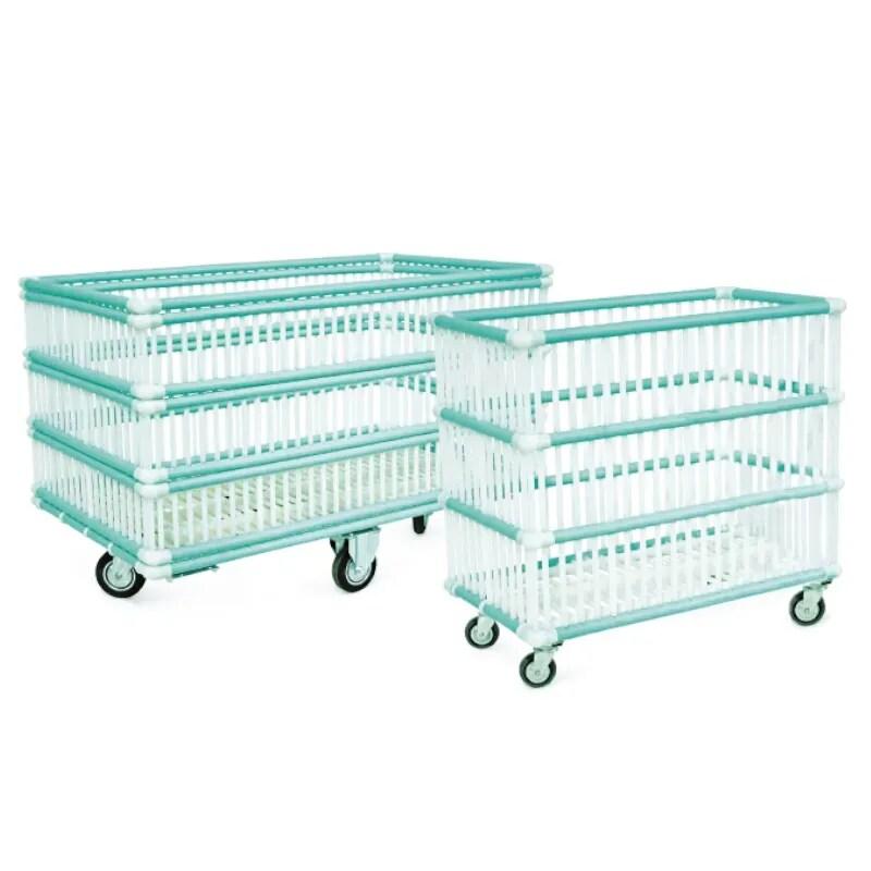 Chariot emboitable 1 ou 2 plateaux. Charge 400 ou 500 kg. Il permet d'économiser 75% de place. Ensemble mécano - soudé, revêtement époxy bleu RAL 5007, plateau avec surface antidérapante et hydrofuge. Ce chariot de magasins est équipé de 2 roues pivotantes et 2 fixes, bandage caoutchouc.