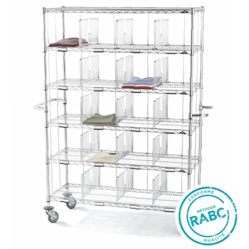 Sclessin 374.841 HYGIRACK Chariot 15 Casiers Professionnel est un chariot professionnel polyvalent équipé de 15 casiers et d'une penderie de 610 mm pour une organisation optimale. - Délai de livraison : 2 - 5 jours ouvrés