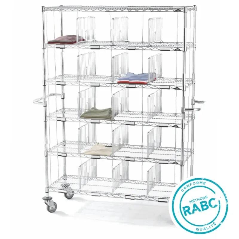 Sclessin 374.841 HYGIRACK Chariot 15 Casiers Professionnel est un chariot professionnel polyvalent équipé de 15 casiers et d'une penderie de 610 mm pour une organisation optimale. - Délai de livraison : 2 - 5 jours ouvrés