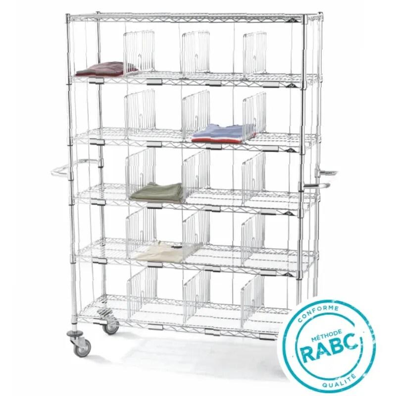 Sclessin 374.842 HYGIRACK Chariot 15 Casiers Professionnel est un chariot professionnel polyvalent équipé de 15 casiers et d'une penderie de 920 mm pour une organisation optimale. - Délai de livraison : 2 - 5 jours ouvrés
