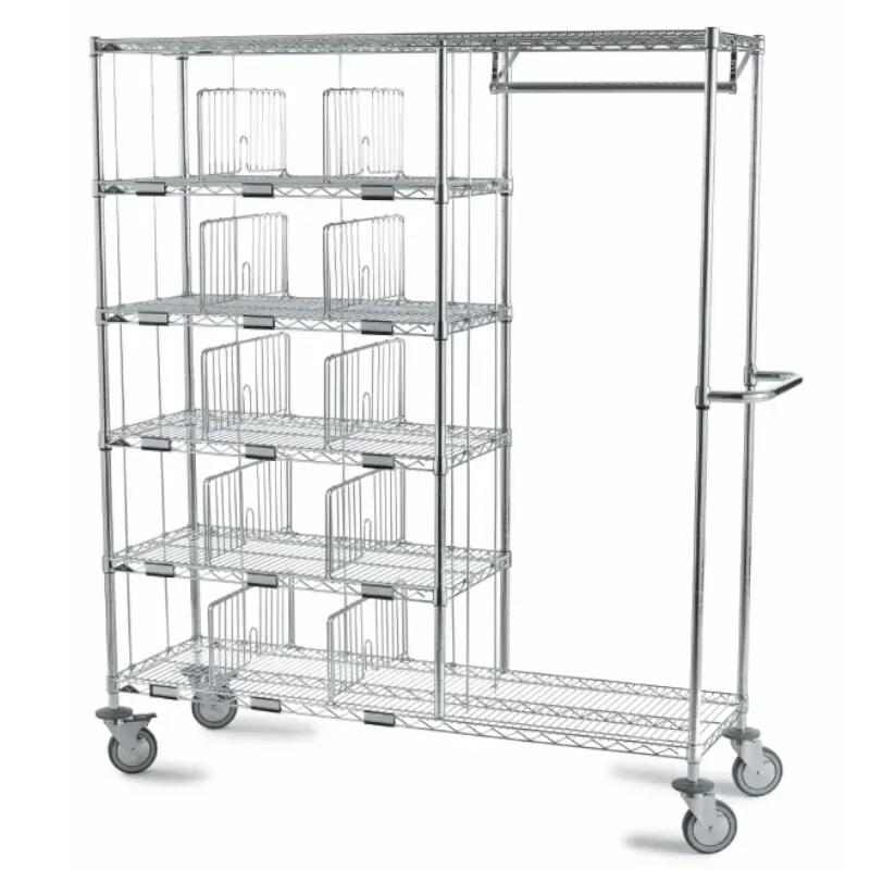 Sclessin 374.843 HYGIRACK Chariot 20 Casiers Professionnel est un chariot professionnel polyvalent équipé de 20 casiers et d'une penderie de 300 mm pour une organisation optimale.