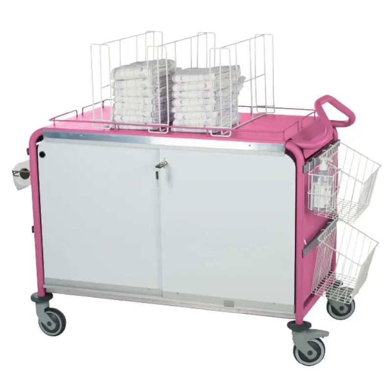Sclessin 374.911C Chariot Nursing Rose Petit Modèle Professionnel est un chariot de soins professionnel compact et robuste avec plateau modulable, conçu pour 15 à 20 résidents.