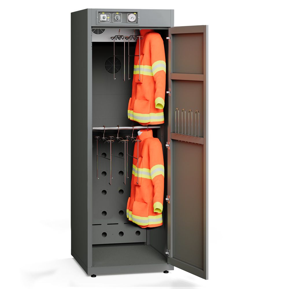 Notre armoire de séchage pour 4 équipements de travail complets offre suffisamment de place pour un maximum de 4 vestes de travail, 4 pantalons de travail et 4 paires de gants. Bien entendu, des équipements tels qu’un casque, un masque ou des chaussures de travail peuvent également être rangÃ