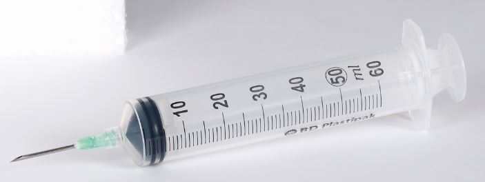 Corps en Nylon, graduée - Contenance 50 ml - Livrée avec 1 aiguille petit diamètre.