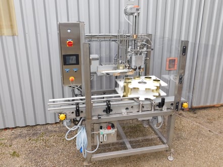 FONCTION - Sertissage automatique de couvercle sur pots inox neuf. - Caractéristiques des emballages : - Diamètre : 100 mm - Longueur : 240 mm - Épaisseur : 1 mm - Matière : inox - Autres dimensions possibles. - CONDITIONS DE TRAVAIL : - La machine est implantée dans une boîte à gant