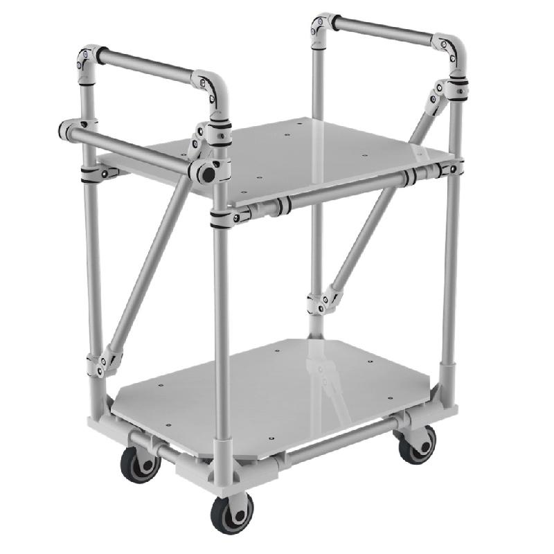 Chariot compact multi-usage équipé de 2 niveaux réglables en hauteur et inclinaison. Poignée ergonomique réglable en hauteur. Structure Aluminium légère et maniable. 2 roulettes pivotantes fixes et 2 roulettes pivotantes avec frein montées sur platines