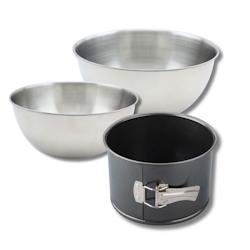 DESCRIPTION: Set à pâtisserie avec moule à manqué 25 cm Zenker, 2 bols à mixer inox de 25 et 20,5 cm, verre mesureur 1L, spatule en silicone de 25 cm - PETIT +: Bols, verre doseur et spatule sont de grands classiques, indispensables dans l'équipement de toute cuisine, et vous serviront pour p