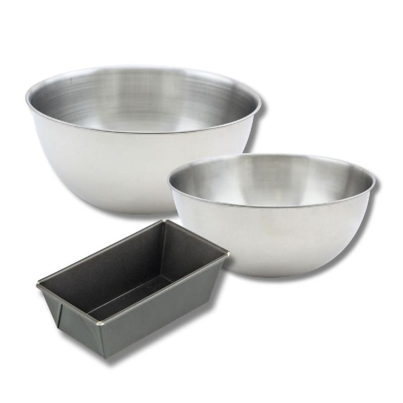 DESCRIPTION: Set à pâtisserie avec 1 mini moule à cake 20 cm Zenker Spécial Mini, 2 bols à mixer en inox de 25 cm et 20,5 cm, et 1 spatule en silicone de 25 cm