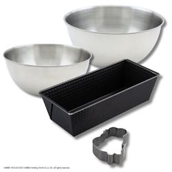 DESCRIPTION: Set à pâtisserie avec 1 moule à cake 25 cm Zenker Haribo et un emporte-pièce motif ours, 2 bols à mixer en inox de 25 cm et 20,5 cm, 1 spatule en silicone de 25 cm