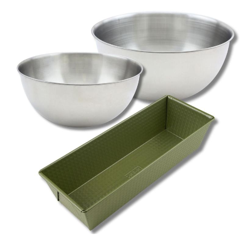 DESCRIPTION: Set à pâtisserie avec 1 moule à cake 30 cm Zenker Green Vision antiadhésif, 2 bols à mixer en inox de 25 cm et 20,5 cm, et une spatule en silicone de 25 cm