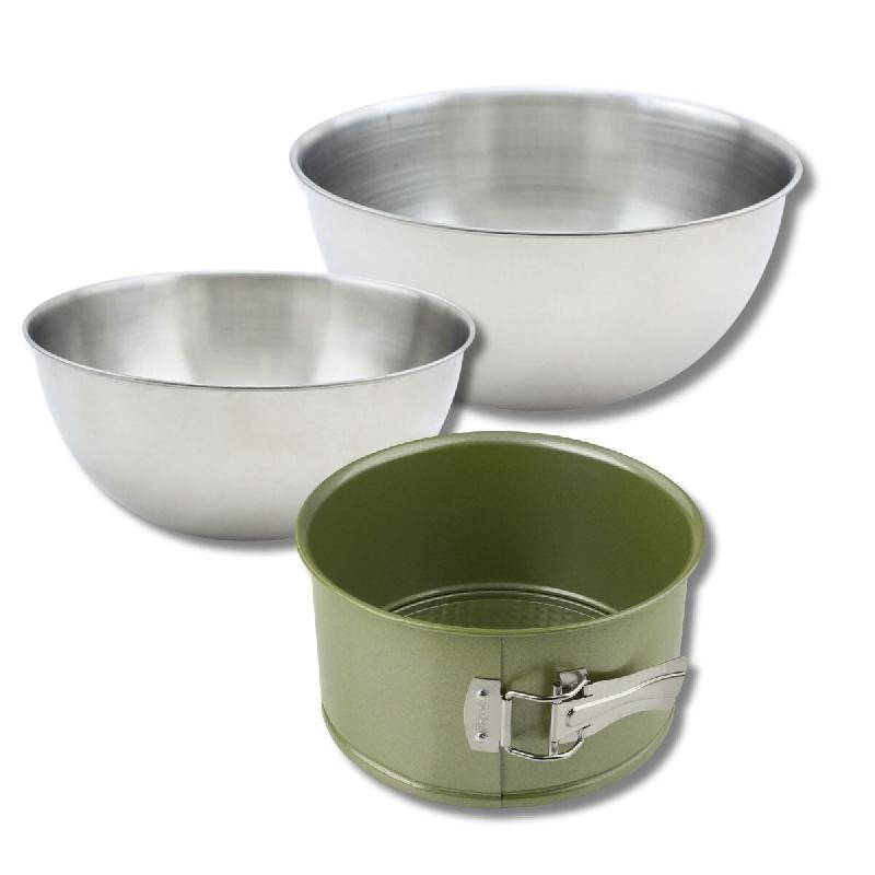 DESCRIPTION: Set à pâtisserie avec 1 moule à panettone de 18 cm Zenker Green Vision antiadhésif, 2 bols à mixer en inox de 25 cm et 20,5 cm, et 1 spatule en silicone de 25 cm