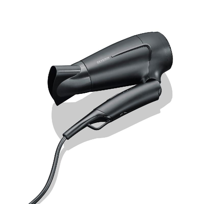 Sèche-cheveux de voyage Severin HT 0159 - Compact, léger et pratique, ce sèche-cheveux pliable est l'allié idéal pour le quotidien comme pour les déplacements - Grâce à sa poignée rabattable, il se glisse facilement dans une valise ou un sac de sport sans encombrement - Son double voltage 110/220-240 V lui permet d'être utilisé partout dans le monde, pour des cheveux impeccables même en voyage - Avec ses 1 600 W de puissance et ses 2 réglages de chaleur et de vitesse, il offre un séchage rapide et une mise en forme précise - Le bouton d'air froid fixe la coiffure et assure une tenue durable - Son concentrateur amovible permet de cibler le flux d'air pour un brushing maîtrisé - Particulièrement ergonomique, il dispose d'un cordon de 1,80 m et d'un anneau de suspension pour un rangement aisé - Un appareil performant, élégant et pensé pour accompagner vos déplacements avec confort et efficacité.Caractéristiques :