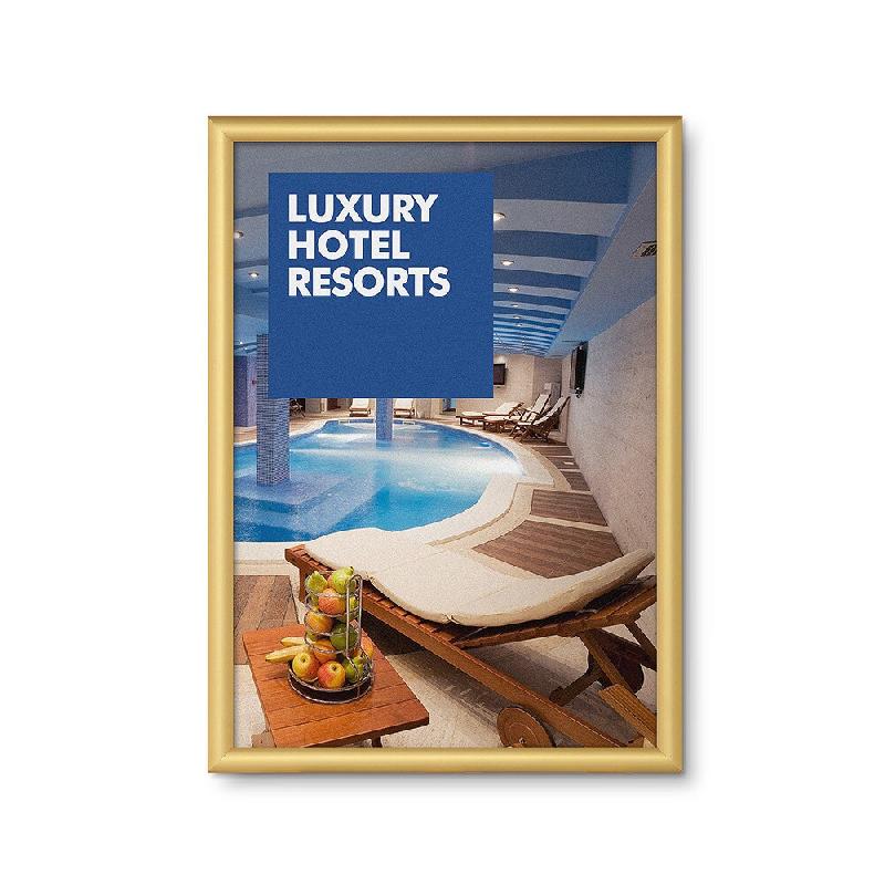 Un style exclusif pour un message qui se doit de briller comme l'or. Le cadre doré à clip de 25 mm est un cadre élégant au profil incurvé. Grâce à son système d'ouverture frontale, vous pouvez changer votre affiche sans décrocher le cadre du mur. Idéal pour l'hôtellerie, le commerce de détail et les espaces publics.