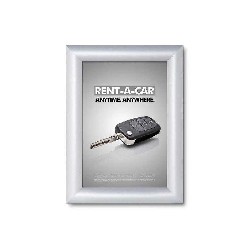 CADRE CLIC CLAC - Profilé 25 mm "angles arrondis" - Ouverture et fermeture facile par clips ressort - Protection de l'affiche par une feuille en PVC anti - reflet - Fixation murale invisible. - Finition Standard : Aluminium anodisé -