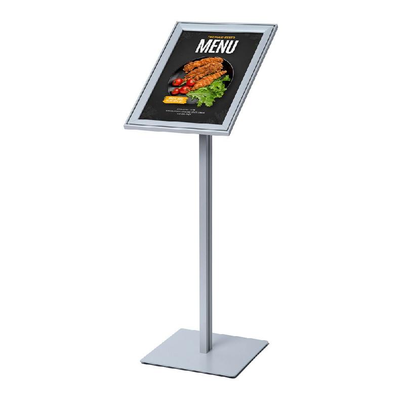 Hauteur totale : 465 mm - Caractéristiques : - Comprend une pochette en U en acrylique, enchâssée dans un profilé en aluminium anodisé argent. - Tube rond anodisé argent. - Pied en acier avec finition peinture poudre argent similaire RAL 9006. - Orientation : Portrait. - Diamètre du tub